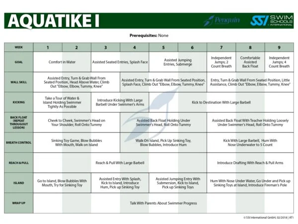 Aquatike I introduces toddlers to foundational swimming skills in a safe, playful environment. The focus is on comfort in the water, early submersion, assisted floating, and breath control. Lessons include interactive games and songs to engage young swimmers.