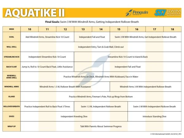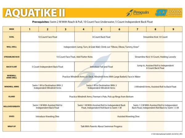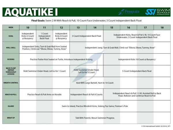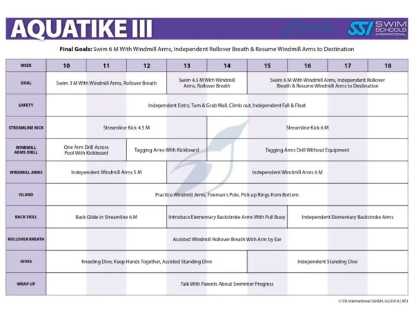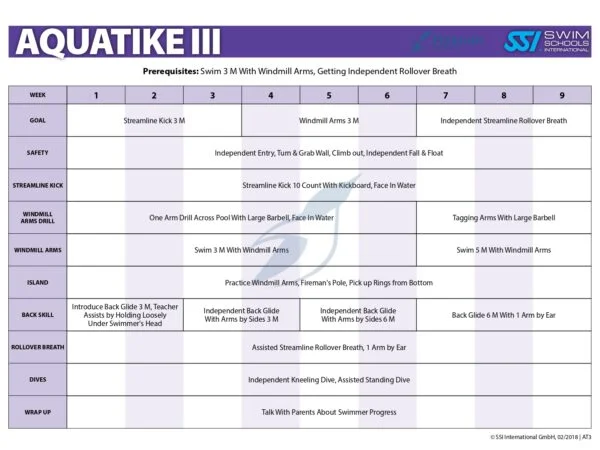 Aquatike III develops more advanced swimming skills such as back gliding, side breathing, and longer distance swimming. This level ensures that toddlers are ready to transition into preschool or beginner swimming levels with proper technique and water safety skills.